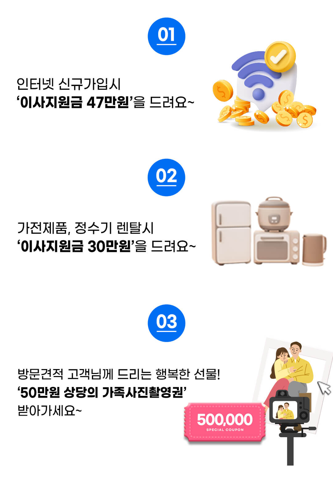 - 안전성: 서비스 세부 점검표로 이사 과정의 신뢰도를 높이고, 고객의 소중한 물품을 안전하게 관리합니다.